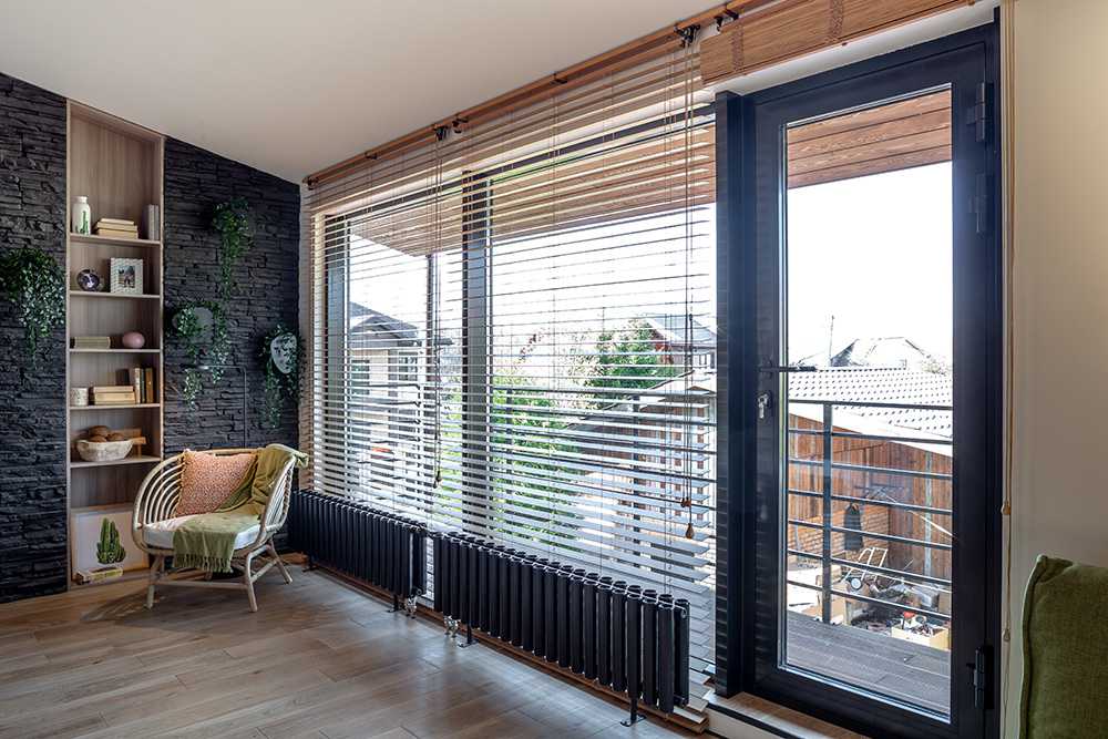 Кстати, про окно! Конечно же, мы установили на него солнцезащиту от AMIGO©️: горизонтальные деревянные жалюзи на системе «Ретро» с декоративной лесенкой.