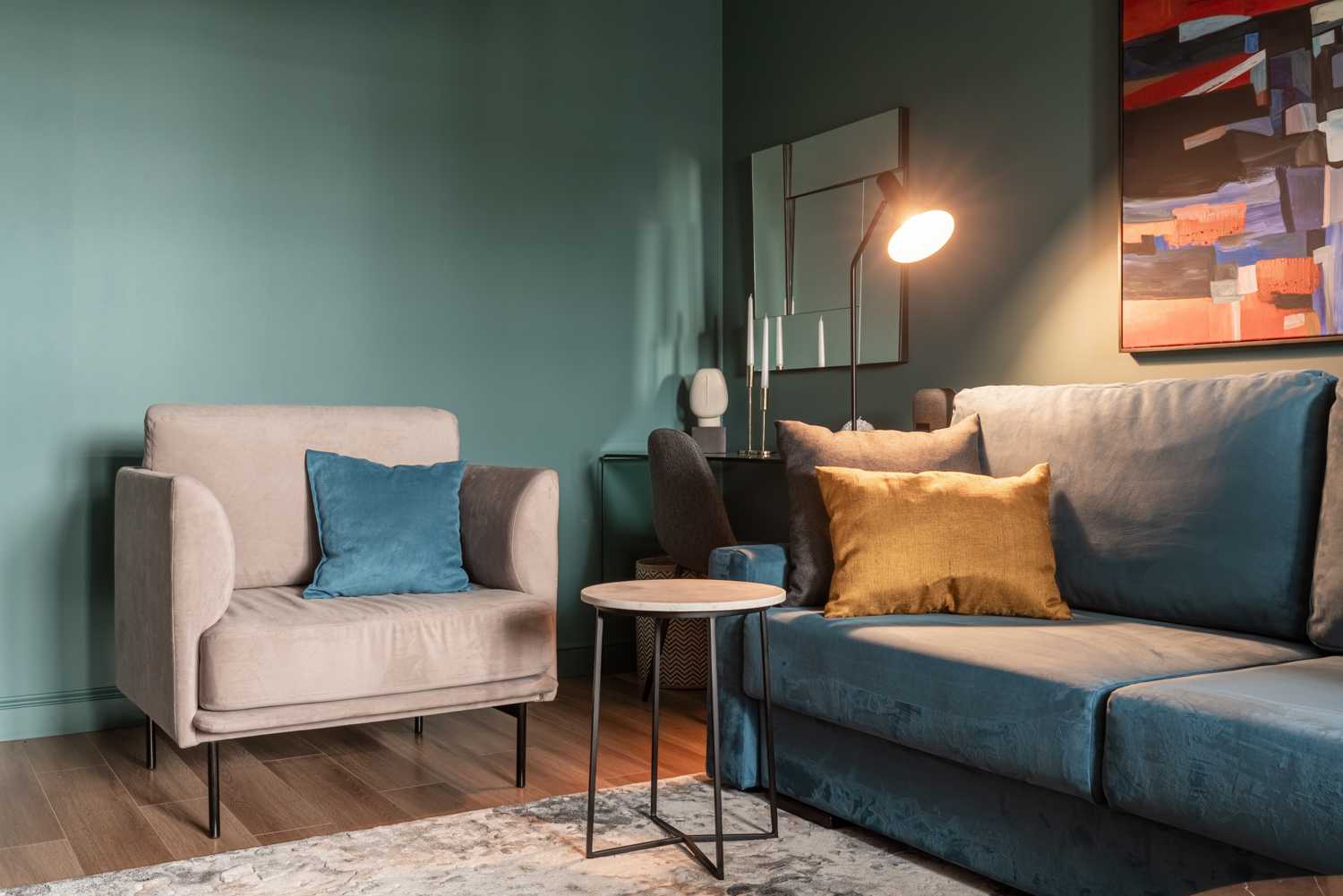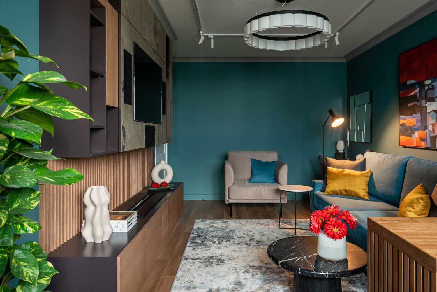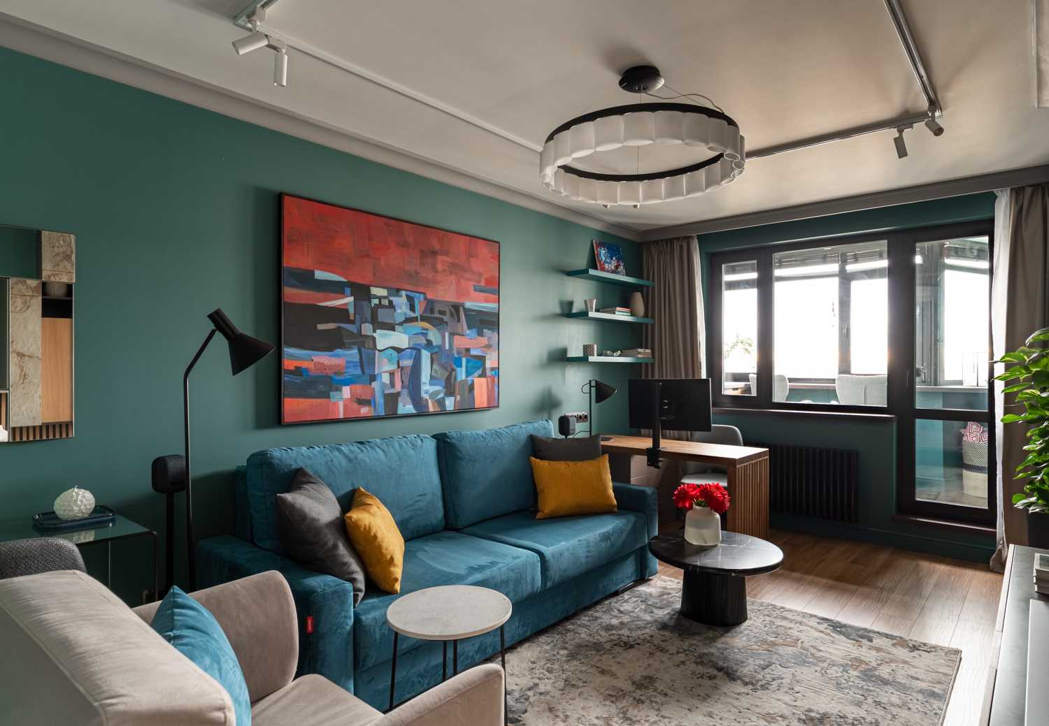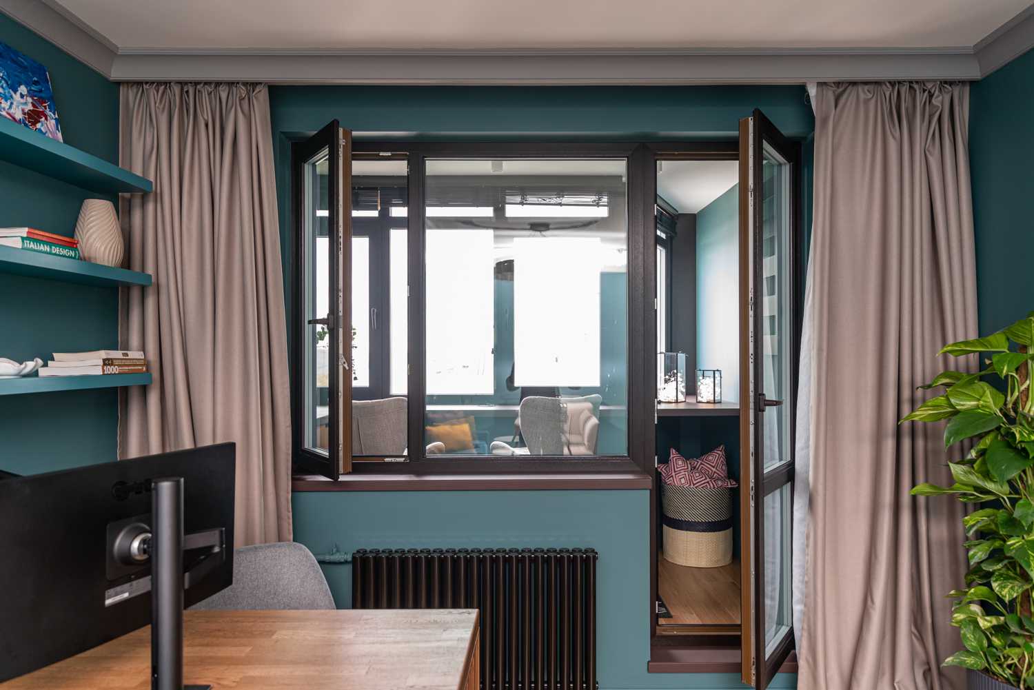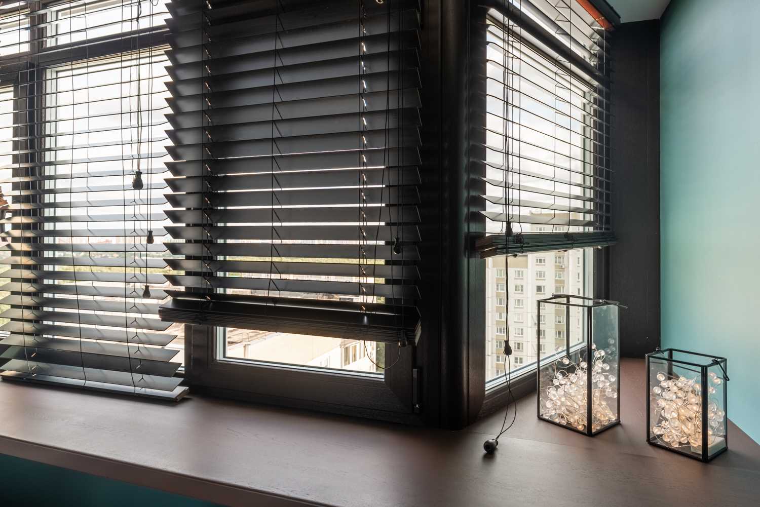 Вдохновением для интерьера нового выпуска программы «Квартирный вопрос» стало озеро Байкал. Именно поэтому отправной точкой в цветовом решении стала его природа и ее оттенки. Стены выкрашены в сине-зеленую краску, для пола подобрана паркетная доска благородного натурального цвета. Насыщенный синий диван, кресло в нейтральном бежевом цвете, продуманный сценарий освещения – все это вкупе складывается в единое пространство, напоминающее героям программы о своем путешествии на Байкал. В поддержку темы натуральных цветов и материалов на окна установлены горизонтальные деревянные жалюзи Первое - это деревянные горизонтальные жалюзи с ламелями из натурального дерева в цвете Венге. Благородство натуральных материалов, стильный темный цвет и ширина ламелей 50 мм придают изделиям особый вид. Жалюзи прекрасно смотрятся на окне, дополняя интерьер, а управление естественным светом благодаря данному виду солнцезащиты простое и удобное. В данном проекте предусмотрены жалюзи с ручным управлением. Второе - для классических штор был установлен моторизованный шторный карниз AMIGO, позволяющий дистанционно управлять полотнами штор при помощи эргономичных пультов или кнопок управления. Кстати, благодаря современным решениям по моторизации управлять шторами и жалюзи можно благодаря мобильному приложению AMIGO Connect и даже при помощи голосового помощника Siri.