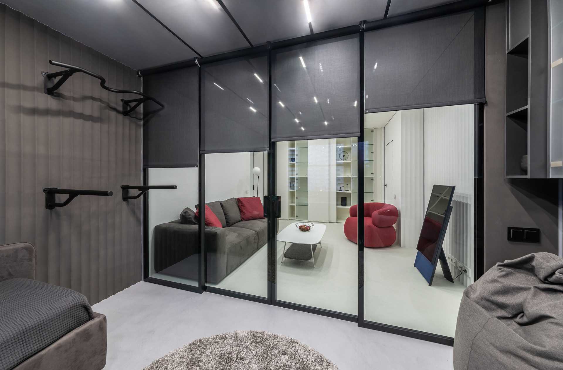 На стеклянные перегородки установлены 2 моторизованные рулонные шторы модели «Классика LVT» Оригинальный цвет изделий «антрацит» в сочетании с тканью СКРИН 5% черного цвета, делают общий вид изделий целостным. Еще одно визуальное дополнение – нижняя рейка штор обернута тканью. Подъем и опускание полотен происходит за счет встроенного электропривода AMIGO, который получает сигнал от сенсорного 15-тиканального пульта управления серии SMART.