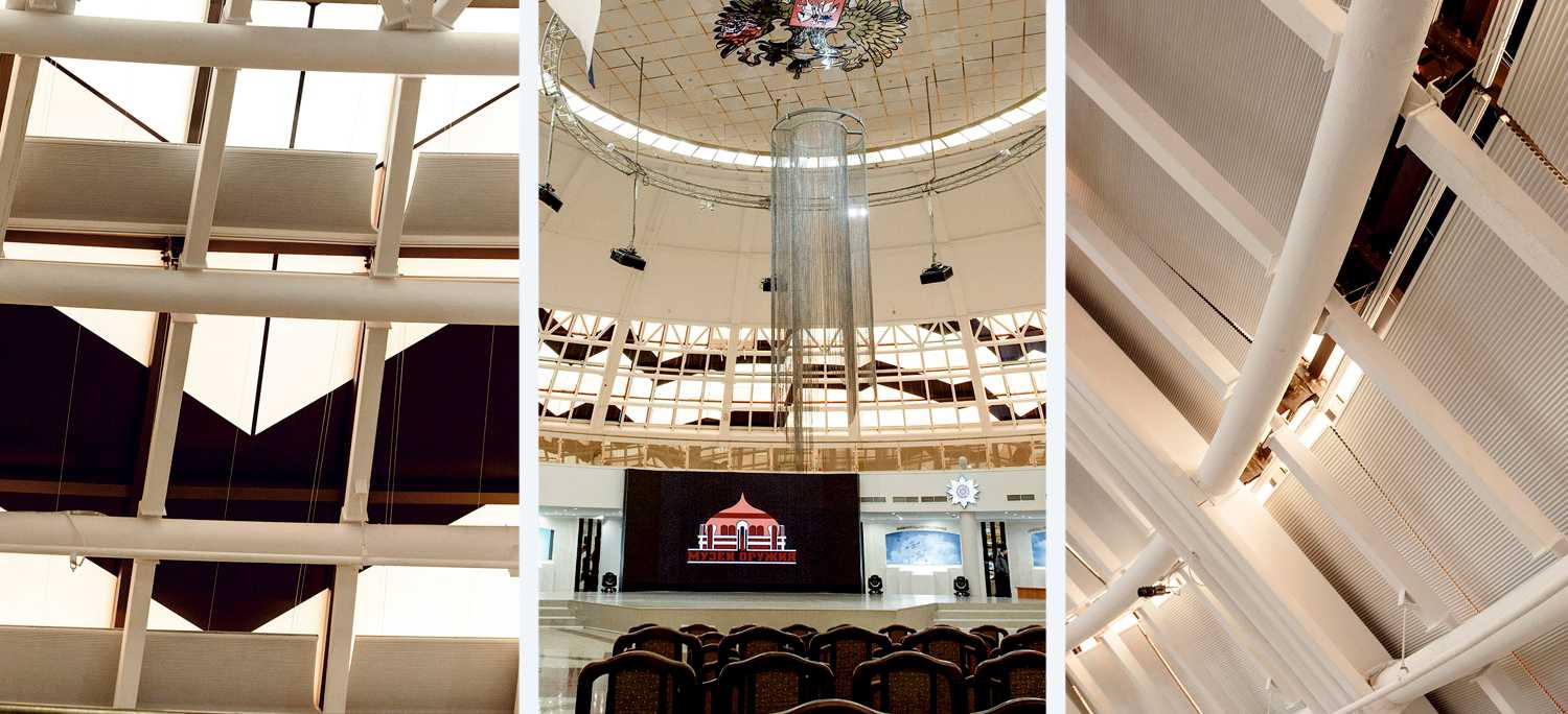 Конструкция купола не позволяла установить шторы плиссе непосредственно на окна. Интересной особенностью объекта стало крепление изделий плиссе на специальные монтажные профили, установленные по всей длине окружности на 3 уровнях. ⠀