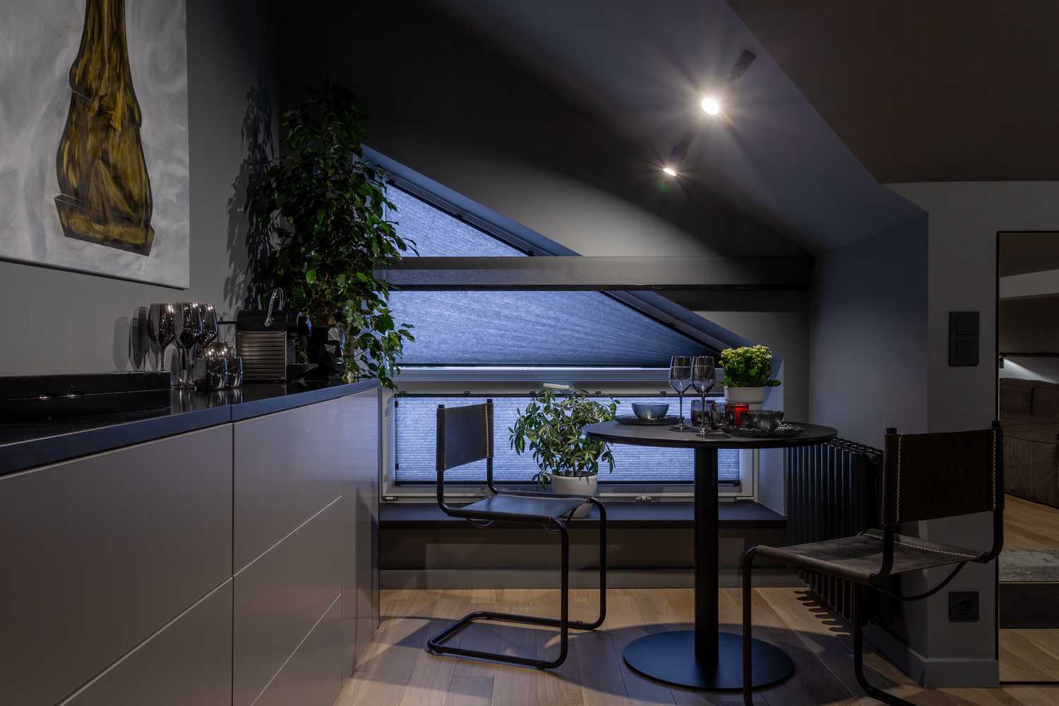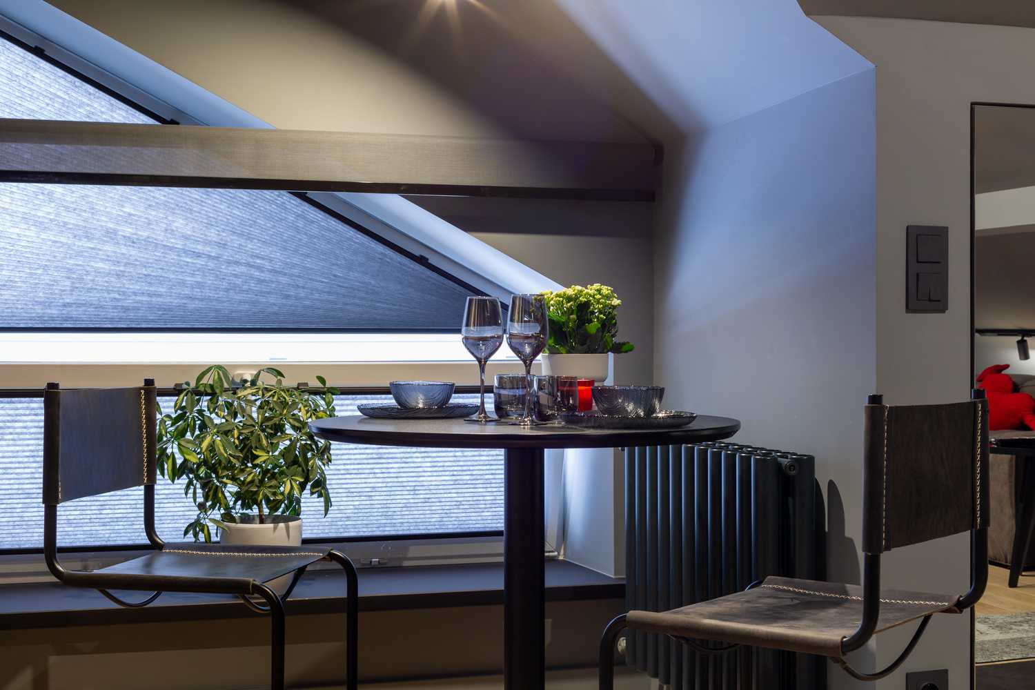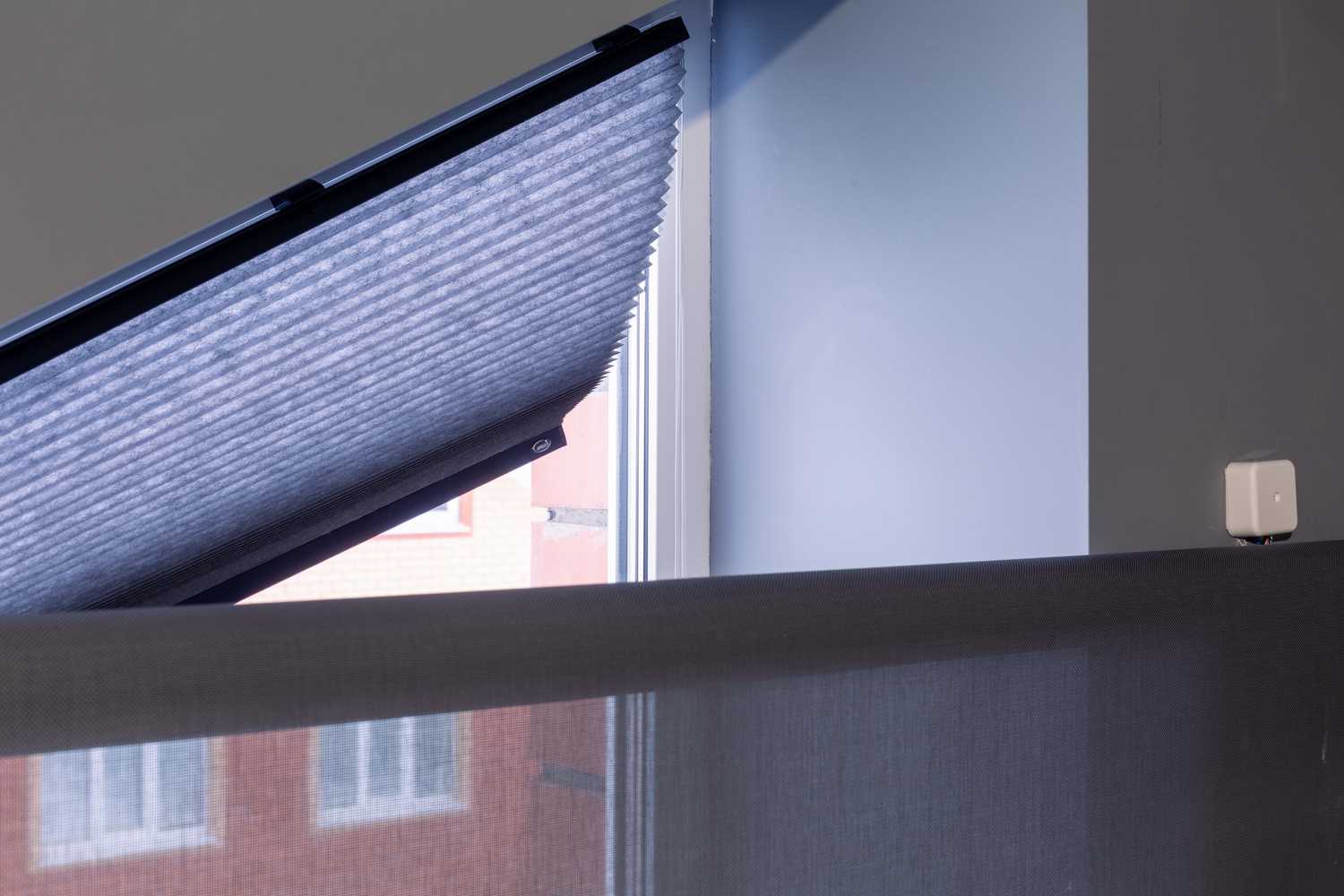 1. Шторы гофре от компании AMIGO, установленные на сами рамы окон, в том числе на треугольные окна. Данный вид солнцезащиты позволяет решить все необходимые функциональные задачи: обеспечить приватность и защитить помещение от излишнего солнечного света. Кроме этого, оригинальная сотовая структура полотна гофре позволяет сокращать теплопотери по всей площади окна и обладает звукоизоляционными свойствами. Фурнитура для штор выбрана черного цвета. Она идеально сочетается с материалом самих штор – тканью ГОФРЕ САТИН темно-серого цвета.