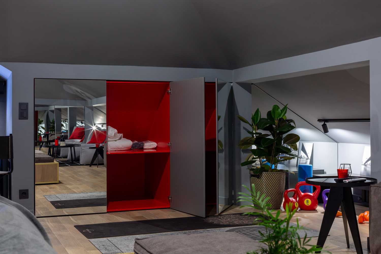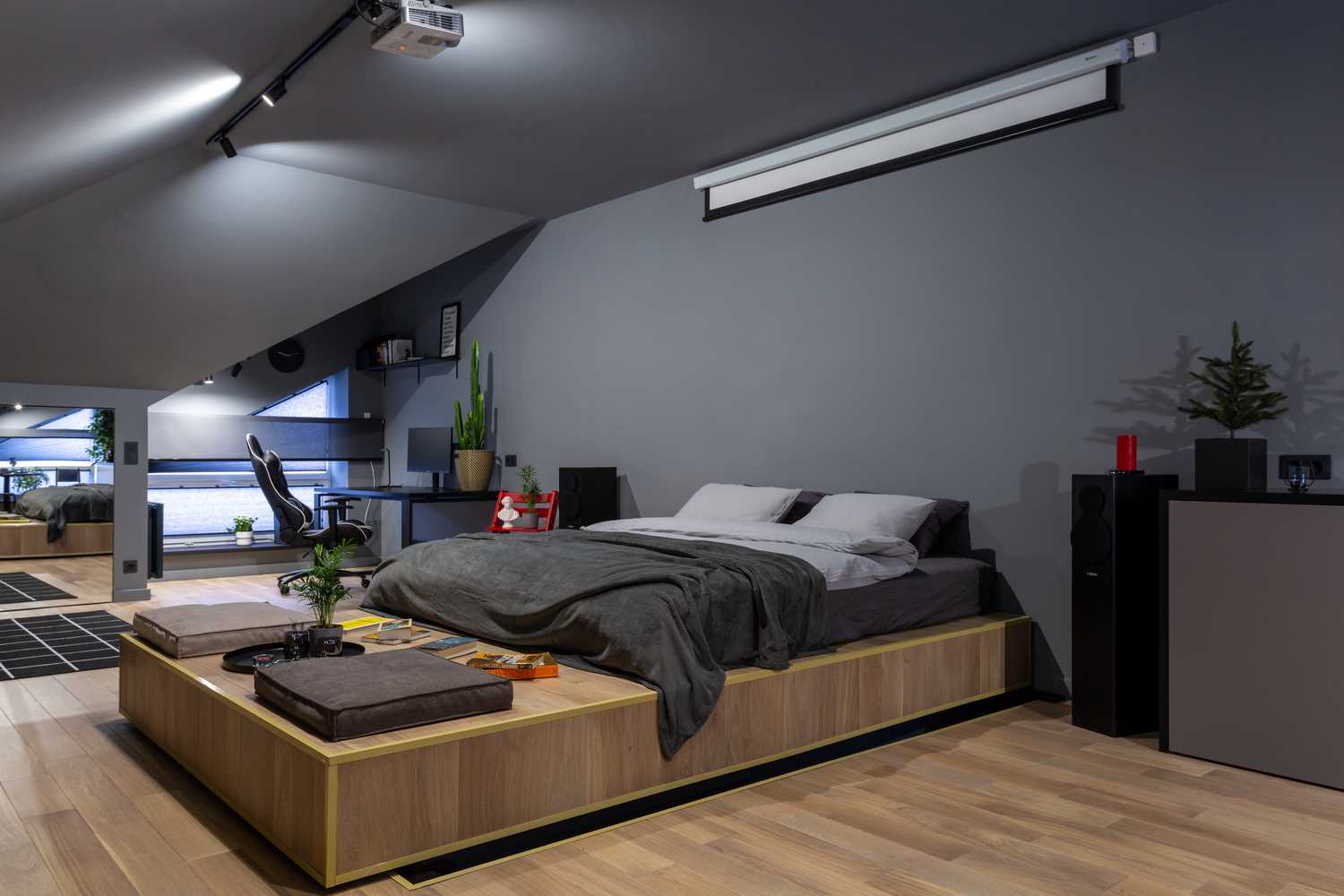Переделка мансарды это всегда интересно, ведь пространство под крышей дает огромный простор для мысли дизайнера. Новый проект программы "Дачный ответ" - не исключение. "Бесконечная мансарда с блуждающим подиумом" - так редакция программы назвала проект. Почему? станет ясно, если вы пролистаете галерею. Мы же хотим отметить очень необычный прием оформления окон, предложенный автором проекта Никулиной Юлианной. Два "слоя" солнцезащиты на окнах нестандартной формы! Зачем? По задумке дизайнера, шторы гофре отвечают за функциональность и обеспечивают защиту от солнца и приватность, а рулонные шторы несут больше декоративный характер.