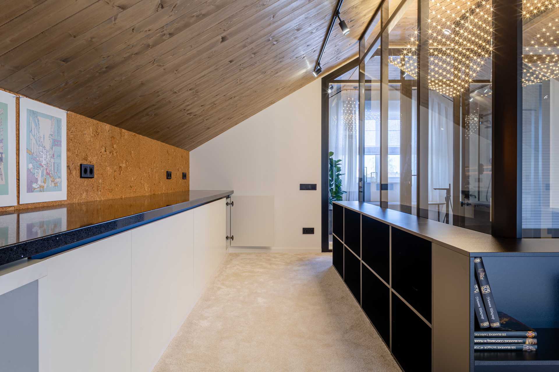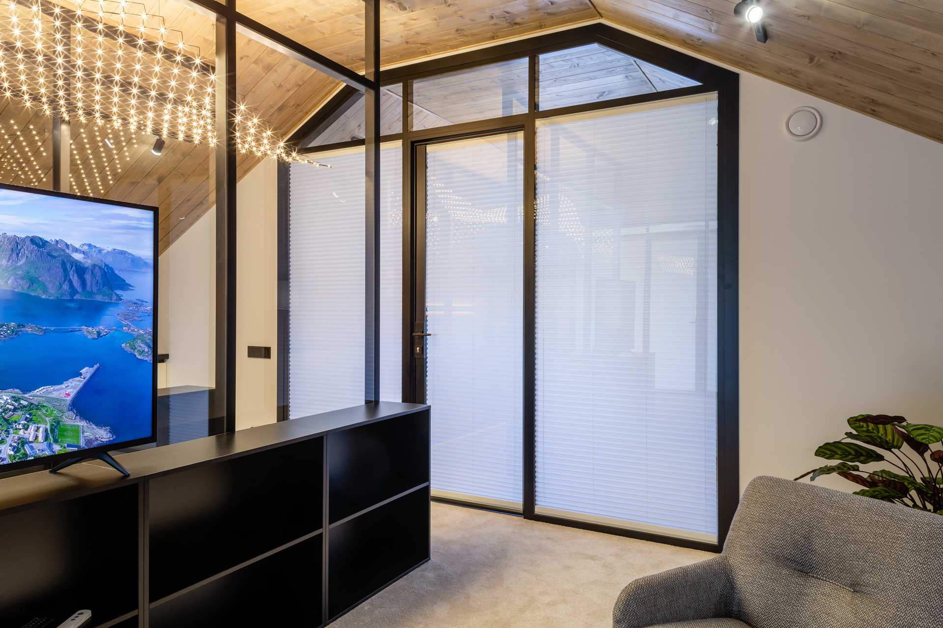 На стеклянную перегородку, разделяющую гостиную и санузел установлены ШТОРЫ ПЛИССЕ от компании AMIGO©️, изготовленные по индивидуальным размерам. Особенность данной системы в плиссированной ткани, которая оригинально смотрится в полотне и позволяет "собирать" ткань, закрывая нужный сегмент окна или, как в данном случае, перегородки. Материалом для штор выбрана ткань Плиссе КРЕП белого цвета. Этот полупрозрачный материал обеспечивает необходимую приватность, при этом пропускает до 45% света.